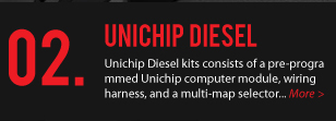 Unichip Diesel kits consists of a pre-programmed Unichip computer module, wiring harness, and a multi-map selector switch
